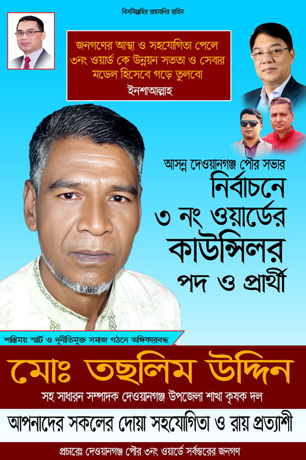 দেওয়ানগঞ্জ পৌর এলাকার ৩ নং ওয়ার্ডের সাধারণ মানুষের প্রত্যাশা, তরুণ ও উদ্যমী সমাজকর্মী, তছলিম উদ্দিন ভাই ,যিনি বর্তমানে বাংলাদেশ জাতীয়তাবাদী কৃষদল-এর দেওয়ানগঞ্জ উপজেলা শাখার সহ সাধারণ সম্পাদক হিসেবে দায়িত্ব পালন করছেন,তাঁকে আগামী দিনে ৩ নং ওয়ার্ডের কাউন্সিলর হিসেবে দেখতে চাই। ওয়ার্ডবাসীর বিশ্বাস, দীর্ঘদিনের রাজনৈতিক ও সামাজিক সম্পৃক্ততা, মানুষের পাশে থাকার মানসিকতা এবং এলাকার মান-উন্নয়নে তাঁর সক্রিয় ভূমিকা ভবিষ্যতে ওয়ার্ডের সার্বিক উন্নয়নে গুরুত্বপূর্ণ অবদান রাখবে। তাই স্থানীয় জনগণ মনে করেন, যোগ্যতা, সততা ও জনসম্পৃক্ততার ভিত্তিতে দেওয়ানগঞ্জ পৌরসভার ৩ নং ওয়ার্ডে কাউন্সিলর হিসেবে তছলিম উদ্দিন একজন শক্তিশালী ও গ্রহণযোগ্য প্রার্থী। আশা করি মাননীয় প্রতিমন্ত্রী এম রশিদুজ্জামান মিল্লাত সাহেবের জন্মস্থান - একটি পরিকল্পিত স্মার্ট শহর তৈরির লক্ষ্যে ৩নং ওয়ার্ড এ তছলিম উদ্দিন ভাই এর বিকল্প আর কেউ নেই। প্রচারেঃ পৌর ৩ নং ওয়ার্ডের সর্বস্তরের জনগণ ও এলাকার মা বোনেরা ।
